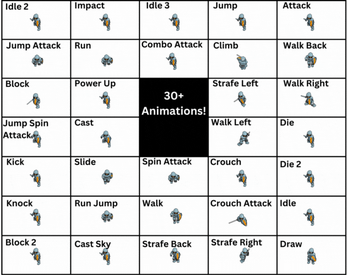 - 13 Animations - Jump Attack, Jump Spin Attack, Spin Attack, Combo Attack, Crouch Attack, Kick, Knock, Cast, Cast Sky, Block 1, 2, Impact, Die 2